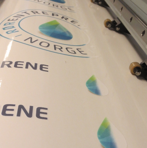 Forrige uke hadde vi leveranse av vår største ordre på digitaltrykkede klistremerker med hvit trykkfarge. Leveransen omfattet totalt 9 000 merker i 3 ulike størrelser til Rørentreprenørene Norge (tidligere Norske Rørleggerbedrifters Landsforening), hvorav halvparten levert på transparent/ gjennomsiktig vinyl. Klistremerkene brukes til alle mulige formål; biler, glass, vinduer, dører, og da underlagene har ulike kulører, må vi tilføre hvit trykkfarge bak logoen i tillegg til en tynn kontur rundt logoen. Uten hvit farge ville logoen ikke være synlig eller fremstått med riktige farger når man for eksempel monterer merket på en sort bil.