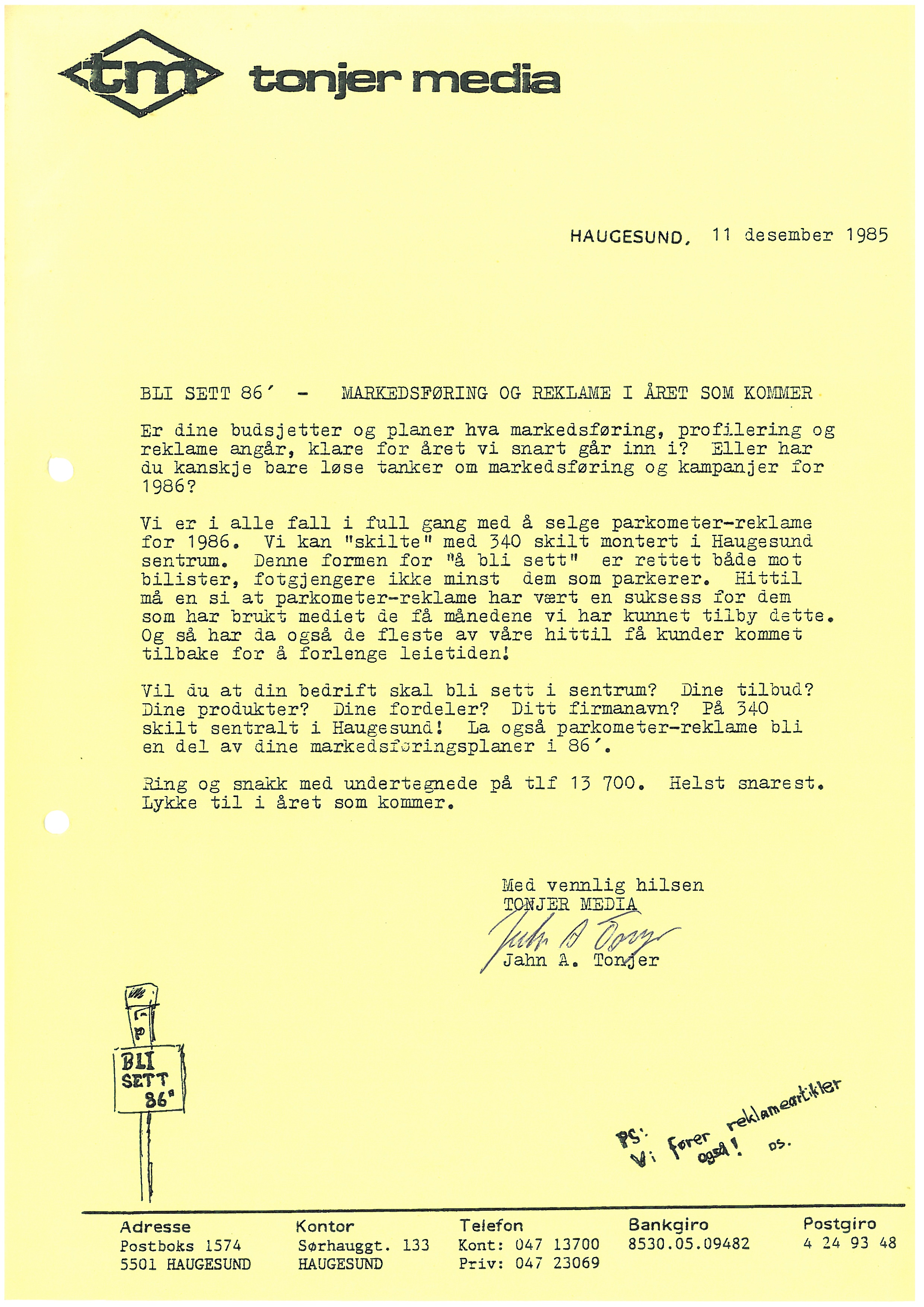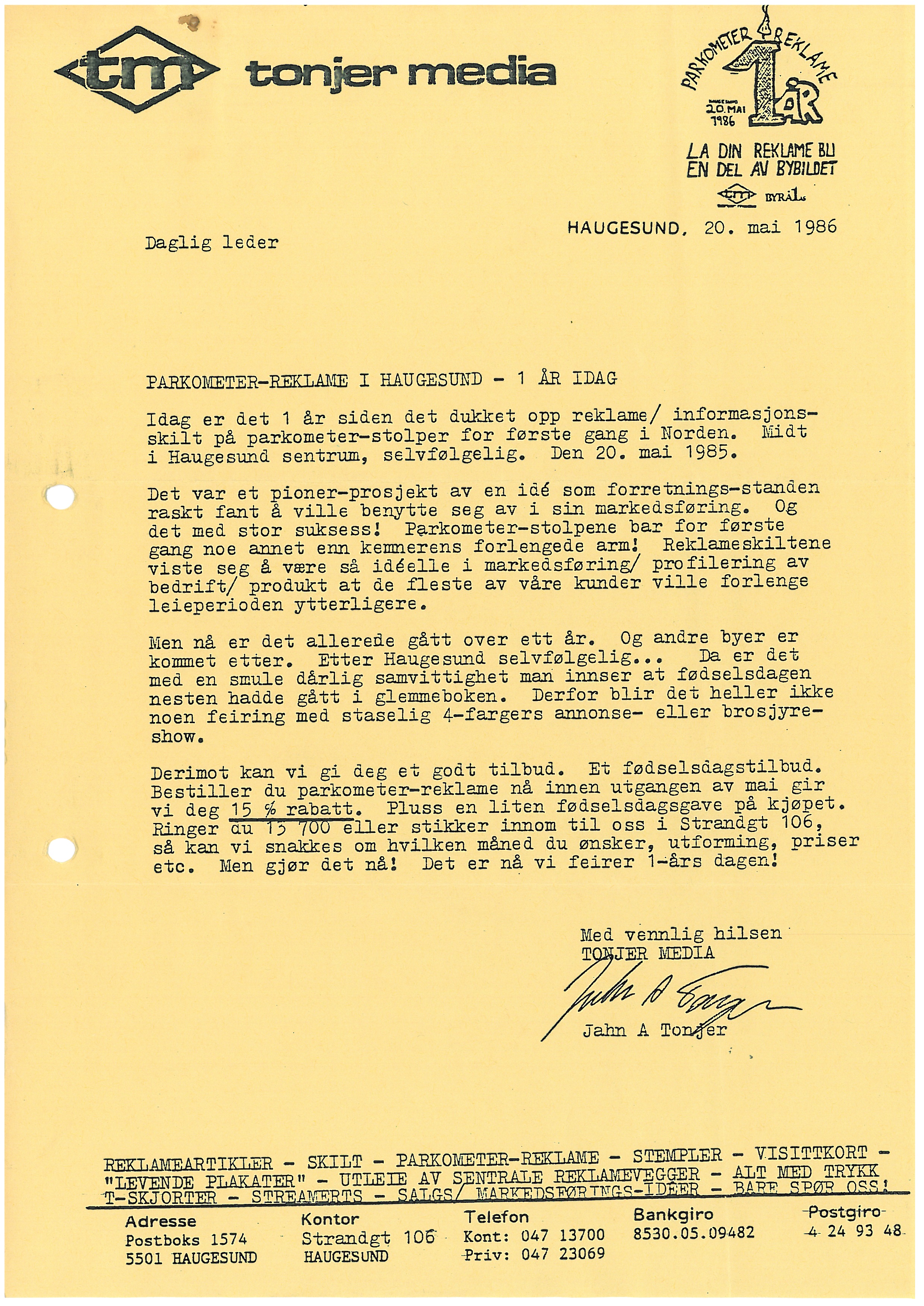 Mange forbinder Tonjer Media med oppstart av reklameskilt på parkometerstolper. På åttitallet var nye reklamekanaler i skuddet, offentlige myndigheter blakke og kreativiteten stor. Husk at dette var før internett, reklamefinanseriet radio og TV2. Haugesund var første by hvor parkometerstolpene ble benyttet som eksponent for reklame i bybildet. Men hvordan startet det?