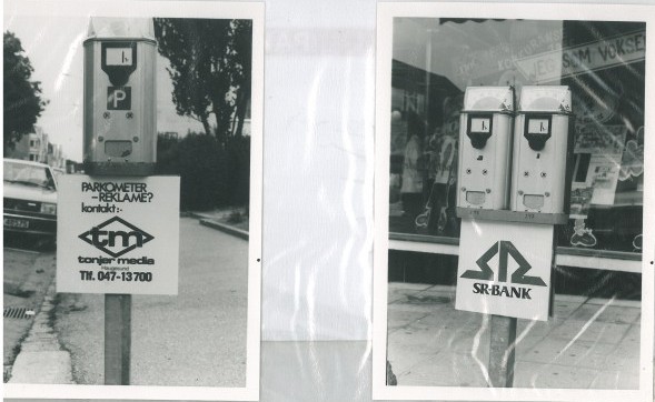 20. mai 1985 ble de første parkometerskiltene med logoen til SR-Bank satt opp i Torggaten utenfor DnC. Markedssjef Einar Osmundsen så sitt snitt til å beslaglegge reklameflatene ved Haugesunds kanskje mest sentrale parkeringsplasser ved fortauet til konkurrenten på årsbasis. I tillegg ble noen få andre plasser leid ut på årsbasis, men i hovedsak ble resten av serien på over 300 skilt leid ut på månedsbasis. Rent teknisk besto innretningen av tosidig aluminiumsskilt festet til stolpen under selve parkometeret. Budskapet ble silketrykket på selvklebende vinyl hos Vestlandske Plastindustri som samme år skiftet navn til Haugesund Silketrykk og etablerte seg på Kvala. Altså innledningen til et godt samarbeid med familien Kalleberg som vi senere skulle gjøre mye forretning med. Monteringen sto vi (dvs. i hovedsak meg) selv for.