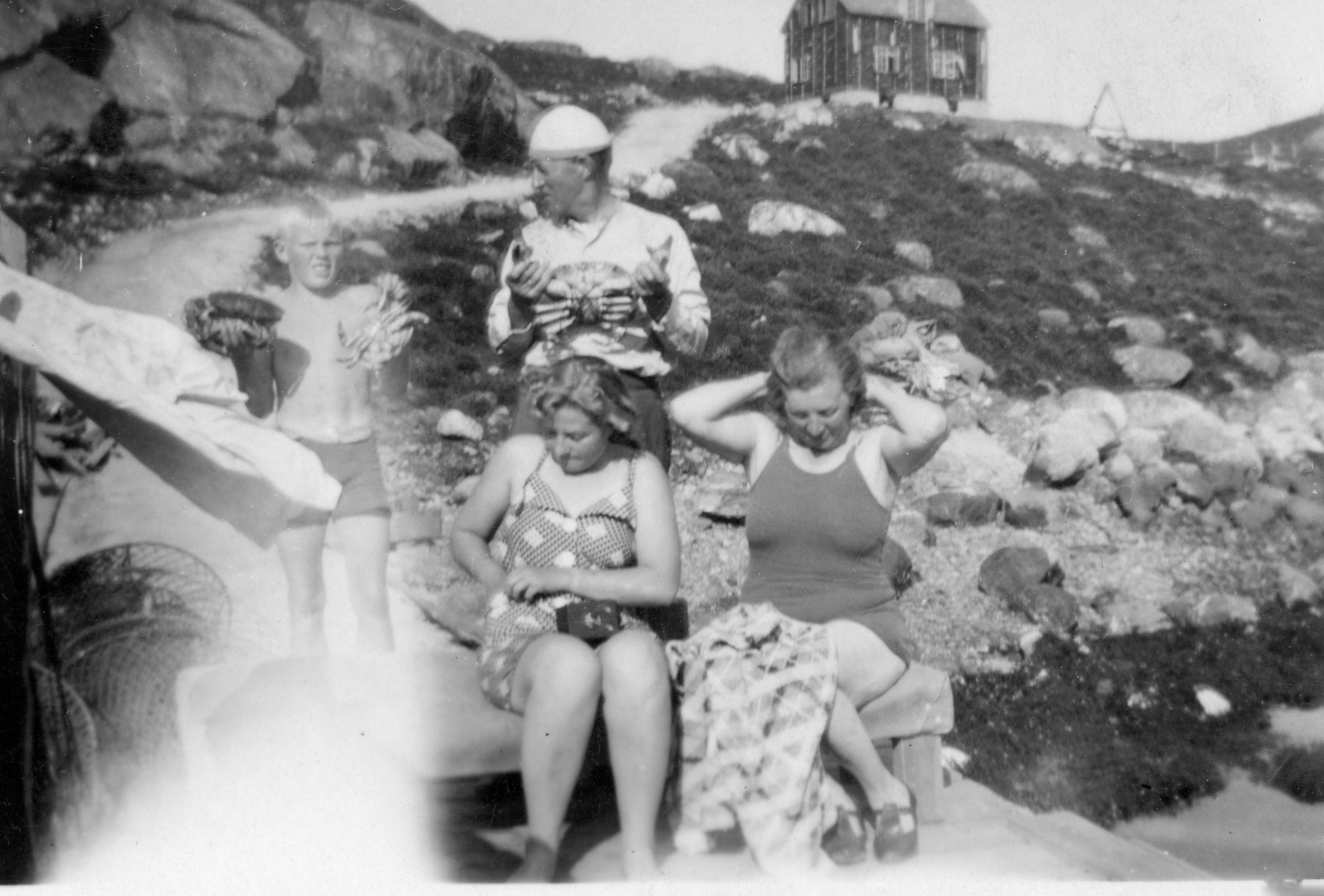Veien ned til naustet på trettitallet. Morfar Einar (bak) og onkel Einar (til venstre). Damene, anyone?