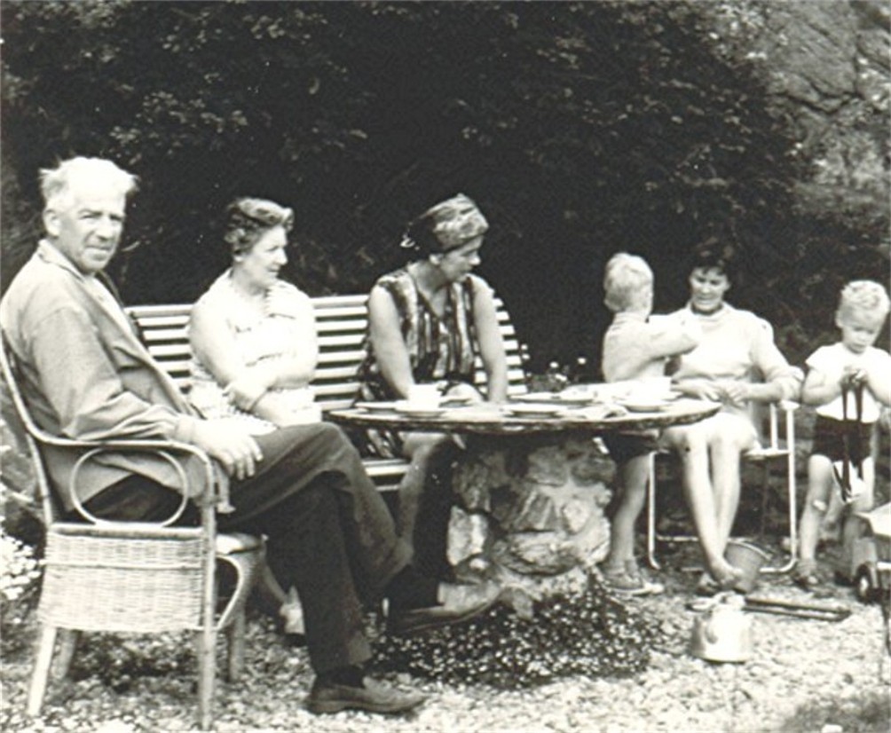 Kaffe rundte steinbordet med Tor & Solveig Andreassen, tante Ruth (Hetland) og min mor (Anne «Søster» Tonjer) med ungene Eivind og meg.