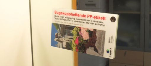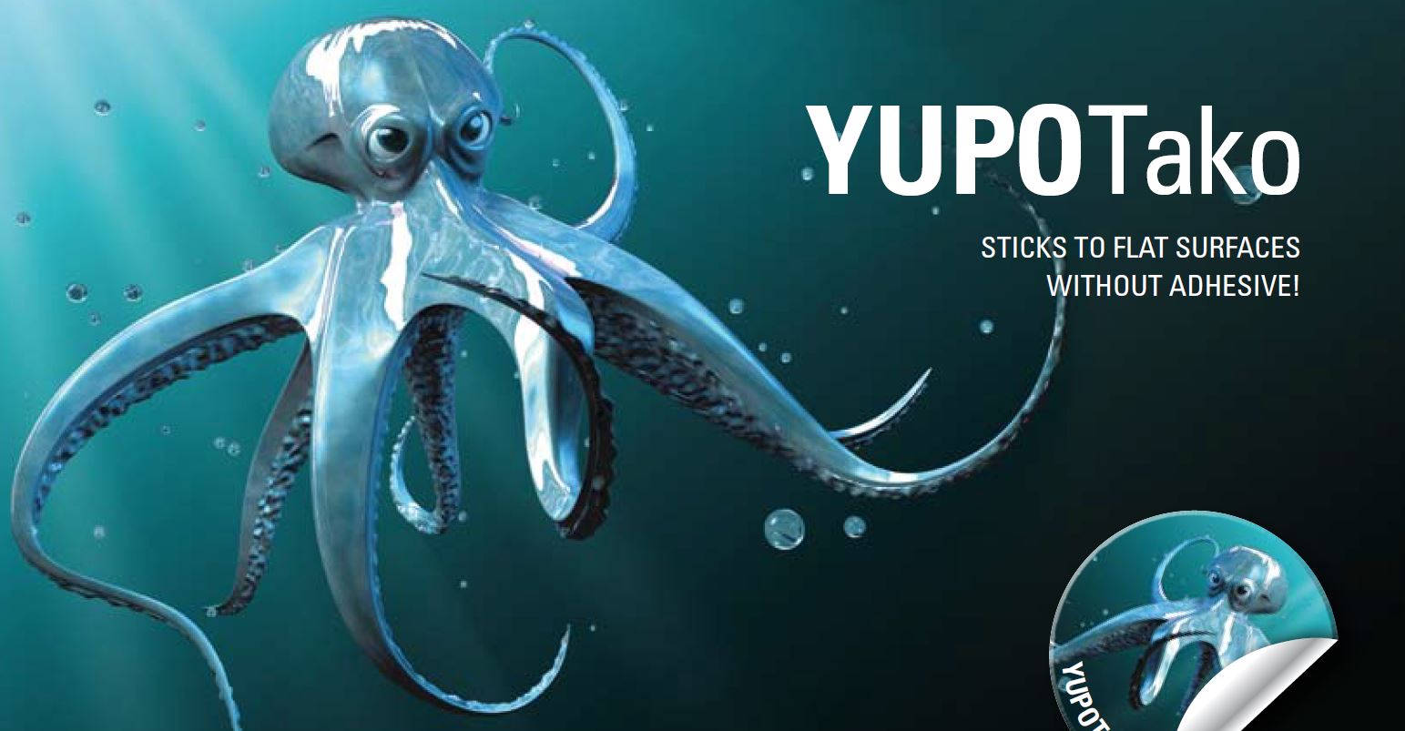 Og her er nyheten: Mikrosugekoppheftene folie! YUPOTako er navnet utviklet av det tyske konsernet Yupo. Tako betyr blekksprut på japansk. Denne PP-folien kleber til plane underlag på samme måte som tentaklene på en blekksprut. Baksiden av folien består av en mikrosugekopp-struktur. Når man monterer merket oppstår tilstrekkelig vakum som holder merket på plass uten lim. Og merkene er lett å fjerne, flytte og bruke om igjen utallig ganger uten limrester. Skulle langvarig bruk føre til at støv og skitt fester seg på baksiden slik at vedheftet blir redusert kan faktisk baksiden vaskes med vann og merket brukes videre. Apropos vann; folien hefter like god på fuktige og duggete underlag. Jeg har i flere uker testet dette på ulike steder på baderommet; på dusjveggen og på speilet. Og testmerket henger like godt. Materialet er også miljøvennlig PVC fritt. Aktuelle trykkmetoder er Eco-solvent digitaltrykk eller silketrykk.