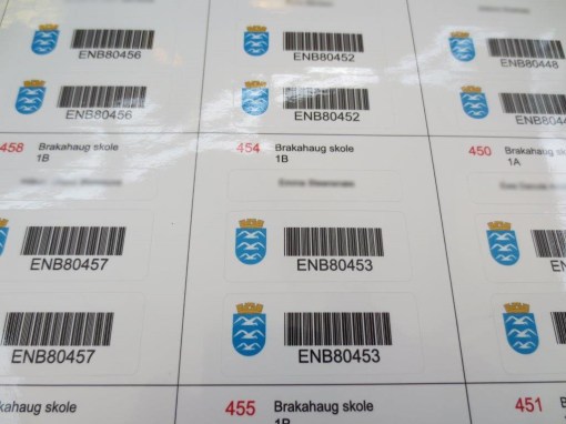 Vi merker stadig økt etterspørsel etter klistremerker og etiketter med variabel tekst. Det kan være serienummer/ løpenummer som f.eks. fra nr 0001 til 4999, men også mer komplekse og variable tekster som skal trykkes på etikettene og tjene et identifikasjonsformål. En slik ordre fikk vi i sommer i forbindelse med Haugesund kommunes anskaffelse av lesebrett og PCer til alle grunnskoleelevene i byen.