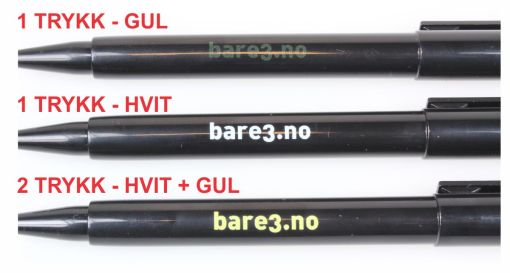 Løsningen er å trykke dobbelt; først et trykk med hvit farge og deretter ett trykk med den ønskede fargen. Dette gjør at trykkkostnaden ved for eksempel gul, rød eller grønn logo på sort penn er noe høyere enn omvendt. På bildet under her ser du øverst hvordan gult trykk alene på sort penn fremstår. Og nederst når den samme gulfargen er trykket over hvit trykk.