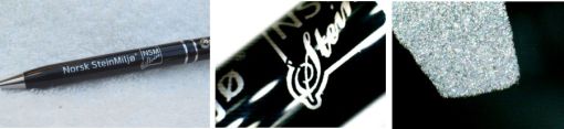 Silketrykket sølv metallic på sort penn gir pent og lystett resultat. Bildene er fra samme kulepenn/ trykk, til høyre i mikroskop.