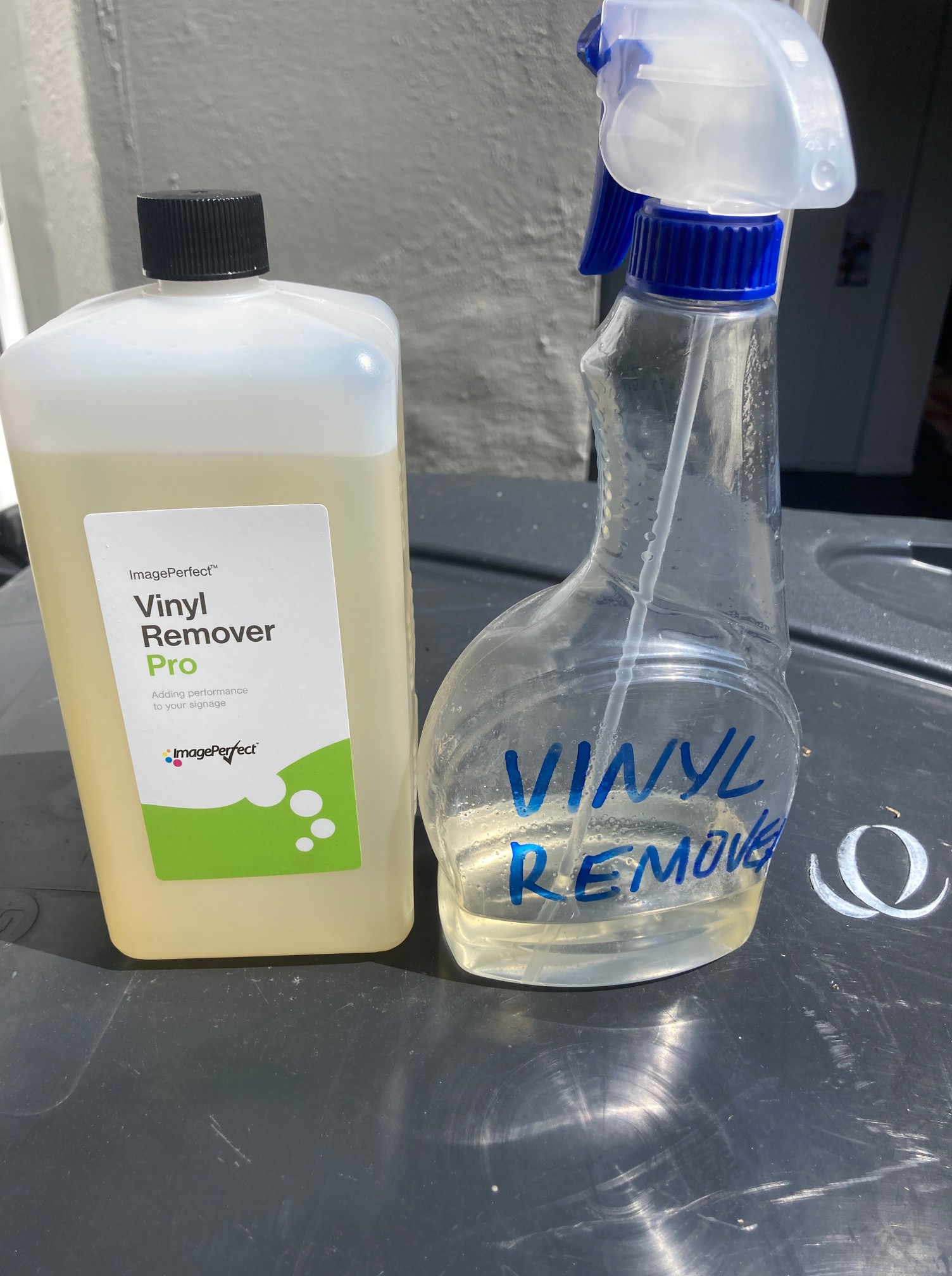 Videre har vi flere væskeprodukter beregnet for påføring av vinylen som skal fjernes. Jeg har lite erfaringer med dette og har ikke inntrykk av at det er mye brukt. Til venstre her ser reklamefilm fra Image Perfect sin Vinyl Remover som bare rulles over dekoren. Etter litt venting kan folien lett fjernes.