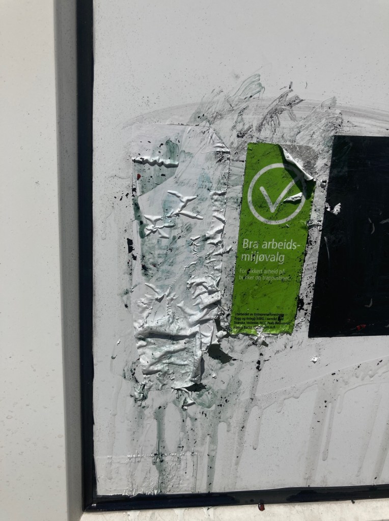 Dette er imidlertid sterke saker, så her må man tenke både HMS og fare for skade på underlaget. Bildet til venstre her er fra vår egen test. På merket til venstre gikk trykkfargen bort og PVC vinylen gikk i nesten i oppløsning. Det grønne merket hadde også laminering og var mer motstandsdyktig og vanskeligere å fjerne. Det skal innrømmes at vi sprayet væsken på og brukte ikke rulle, så noe av sølet her kan henføres på vår uerfarenhet med produktet.