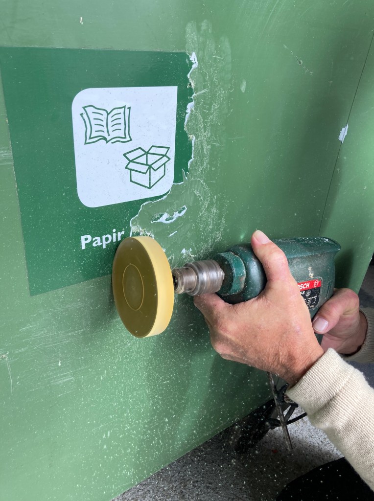 En annen løsning hvis du har store problemer med å fjerne selvklebende vinyl er å bruke dekorfjerner på elektrisk drill. Det er tilsynelatende flere varianter av denne, eventuelt like produkter under ulike brand. Vi har testet den fra Biltema (artikkel nr 20-011) Denne kan kjøres i inntil 4000 omdreininger pr minutt. Sliperen fungerer bra, men er tidkrevende. Dette må være siste utvei hvis du ikke får folien av på annen måte. Vi prøvde den på gamle refleksklistremerker på en aluminiums-tilhengerkarm. Gikk helt fint. Vi prøvde den også på en plast avfallsbeholder (se bildet), til tross for at det står klart på anvisningen at den ikke er egnet for plastmaterialer. Resultatet var helt greit, men plasten ble noe mattet der hvor det var slipt. Tips, bruk støvmaske!