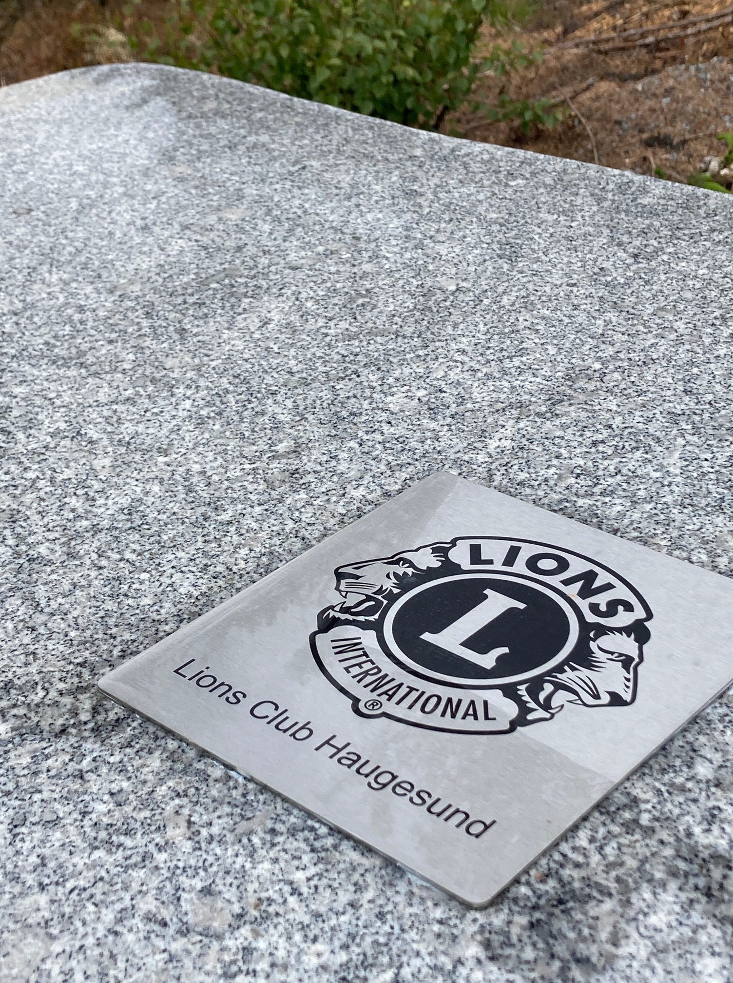En av de aktuelle løsningene var lasergraverte stålskilt. Disse kan leveres i inntil 2 mm tykkelse i syrefast rustfri stål (AISI 316-kvalitet). Se tidligere bloggpost om stålskilt her >>>. Denne skilttypen er meget velegnet for permanent utendørs bruk her på vestlandet. Vi har tidligere levert slike skilt til samme lionsklubb for bruk på granittbord ved rasteplasser langs turstien rundt Eivindsvannet. Et prosjekt som også var sponset av Lions Club Haugesund. Lasergraverte stålskilt er godt egnet for ordre på ca 5 – 50 skilt, men kan bli noe kostbar løsning ved større antall/ formater i forhold til alternativene.