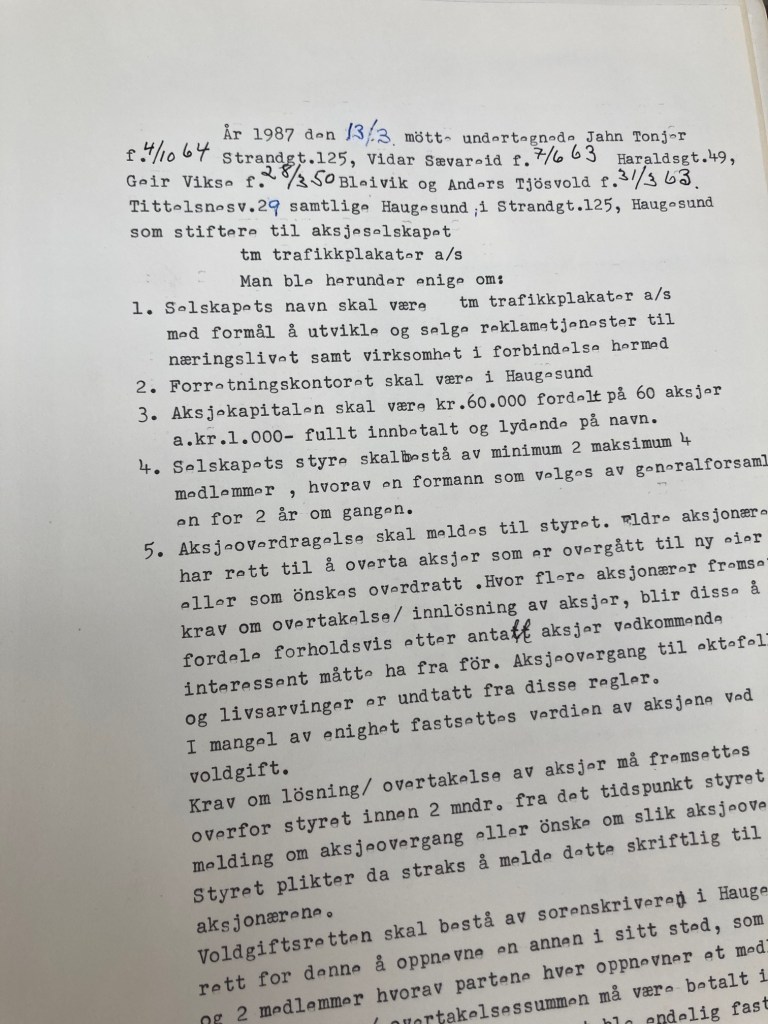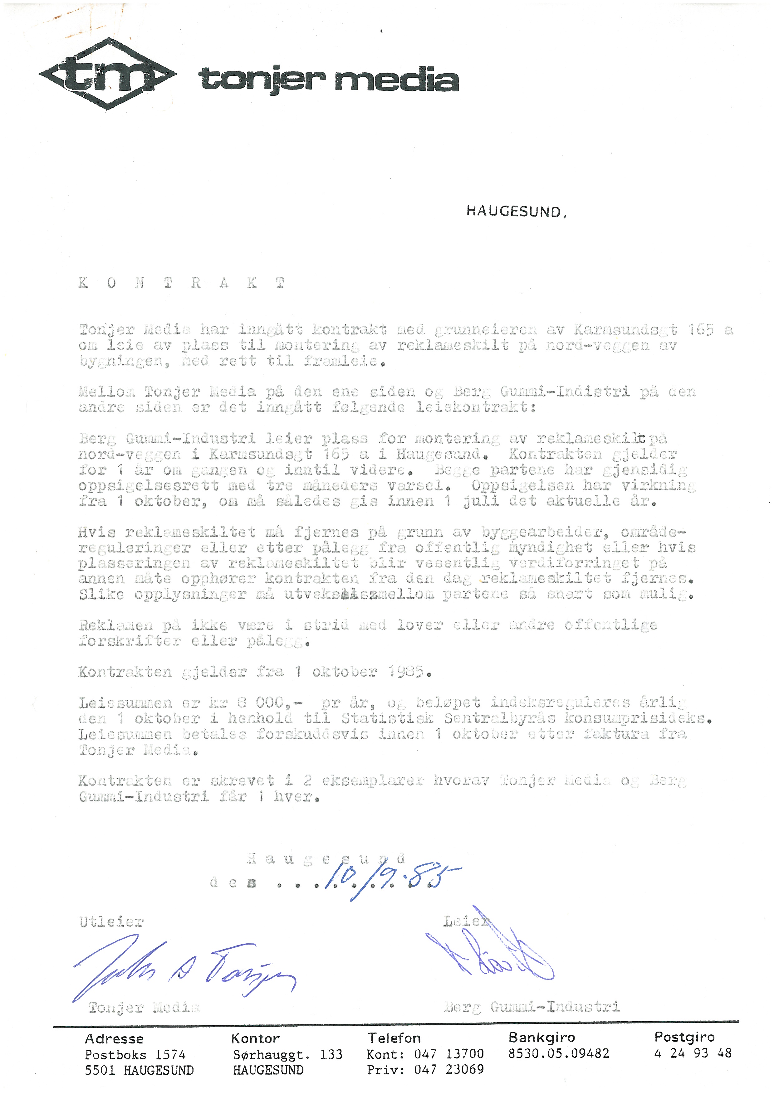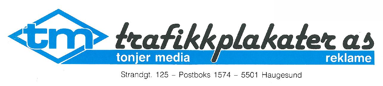 Bakgrunnen for denne etableringen av aksjeselskap var et nytt prosjekt; busskur-reklame. Som jeg har skrevet i tidligere bloggposter drev jeg i denne tiden med parkometerreklame (se her >>>) og dette var på vei til å bli faset ut. Gjennom vinteren hadde jeg utredet mulighetene for å etablere en plakatserie på Haugaland Billags leskur som erstatning for parkometerskiltene. Avtale med billaget var tegnet og jeg fikk med Geir, Anders og Vidar i finansieringen av skiltene med 20 % hver. Løsningen ble da et aksjeselskap med navn TM Trafikkplakater as. Dette ble drevet parallelt med enkeltmannsforetaket Tonjer Media et par år, før alt etterhvert ble samlet i as’et. I april 1994 flyttet vi til Reklamegaarden, Karmsundgt 264 og benyttet samtidig anledningen til formelt skifte navn til Tonjer Media as og fikk også da ny logo.