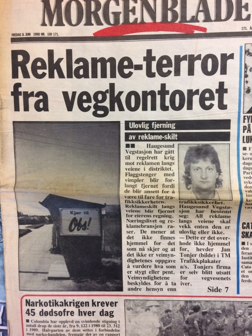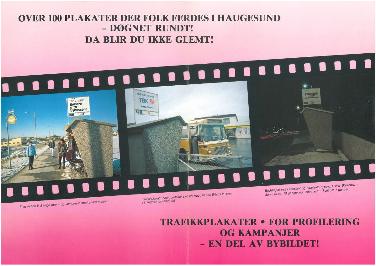 En av disse jeg besøkte for å selge parkometerreklame til var Bergs Gummi Industri. Arne Berg hadde gjort det skarpt lang utover Haugesunds grenser med bildekk, men virksomheten ble fortsatt styrt fra Sørhaug. Etter min presentasjon av reklamemulighetene på parkometrene, kommenterte daglig leder Knut Håvik; «Jo, vel og bra dette, men vi kunne heller tenke oss et stort skilt. En stor eksponeringsflate på et meget sentralt og trafikkert sted. Istedenfor mange småskilt på parkometrene nede i sentrum….». Javel, bomtur tenkte jeg. Eller kanskje ikke… Det var jo andre som gjorde business på utendørs reklameplasser. Helge Bøe hadde allerede vært i gang med plakatklistring i over ett år og var begynt å skaffe flere utendørs boardsplasser. Dessuten hadde jeg jo tanker om lignende ting før militæret også. Og det passet inn som et komplimenterende produkt til parkometerreklame. Kanskje dette var noe?