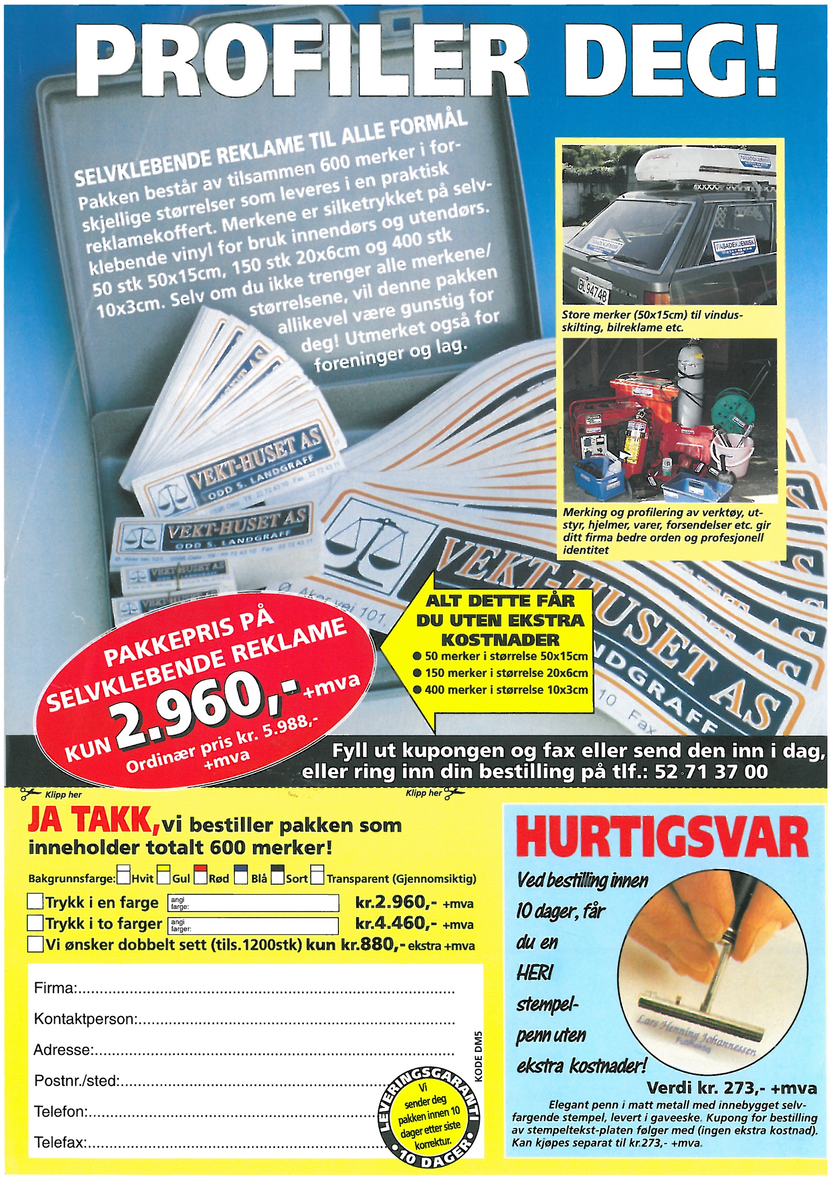 1 02 2014I kategorien TM-nostalgi har jeg i dag funnet fram en DM på selvklebende pakke fra rundt 1996. dette var et produkt jeg tror vi «fant opp» i 1995. Flere størrelser av gode klistremerker til altmulig bruk i småbedrifter ble en stor suksess. Ideen om å levere dette i en koffert ble stjålet fra en leverandør i Tyskland som leveret «pakkeløsninger» på penner og lightere i ryggsekker. Kombinert emballasje og tilgift. På denne tiden var uadressert reklame til handlende og kontorer med Posten rimelig. Jeg tror et A4 ark kostet rundt 50 øre, og vi hadde kampanjer som dekket hele landet. Produktet ble en stor suksess og vi solgte hundresvis av «kofferter» i året på denne tiden.